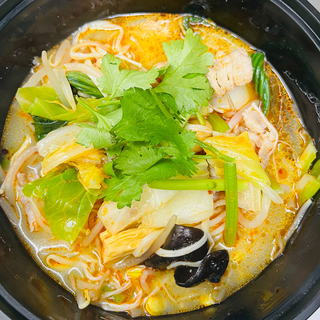 野菜が多いのでボリュームたっぷり、牛肉や羊肉を入れるとお腹いっぱいになります。辛い食べ物が苦手な方には辛さを控えめにしてご提供できます。味わいとしては中国の火鍋に近いです。